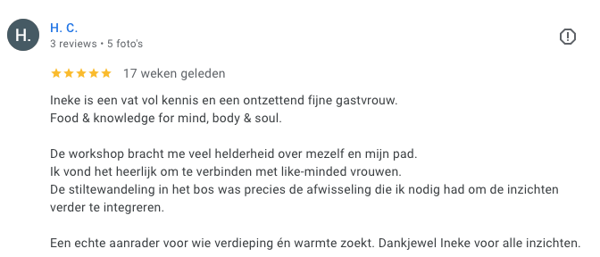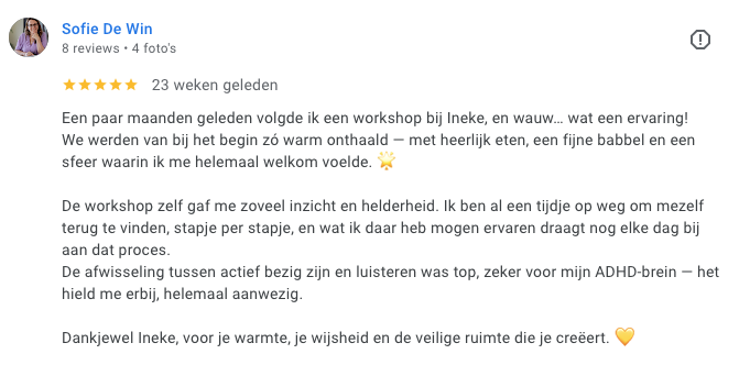 "Dankjewel voor de fantastische dag! Wat een fijne indrukken en enorme groeimomenten heb ik mogen ervaren. Van het warme onthaal tot de rustgevende sfeer, alles was perfect verzorgd. De dag voelde gezellig en persoonlijk, en ik voelde me meteen op mijn gemak. Elke activiteit was zorgvuldig gekozen en had echt impact op mijn groei. Het was een dag van verdieping, reflectie en verbinding. Zeker een ervaring die ik niet snel zal vergeten!".